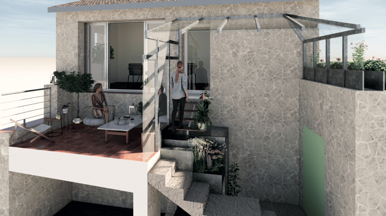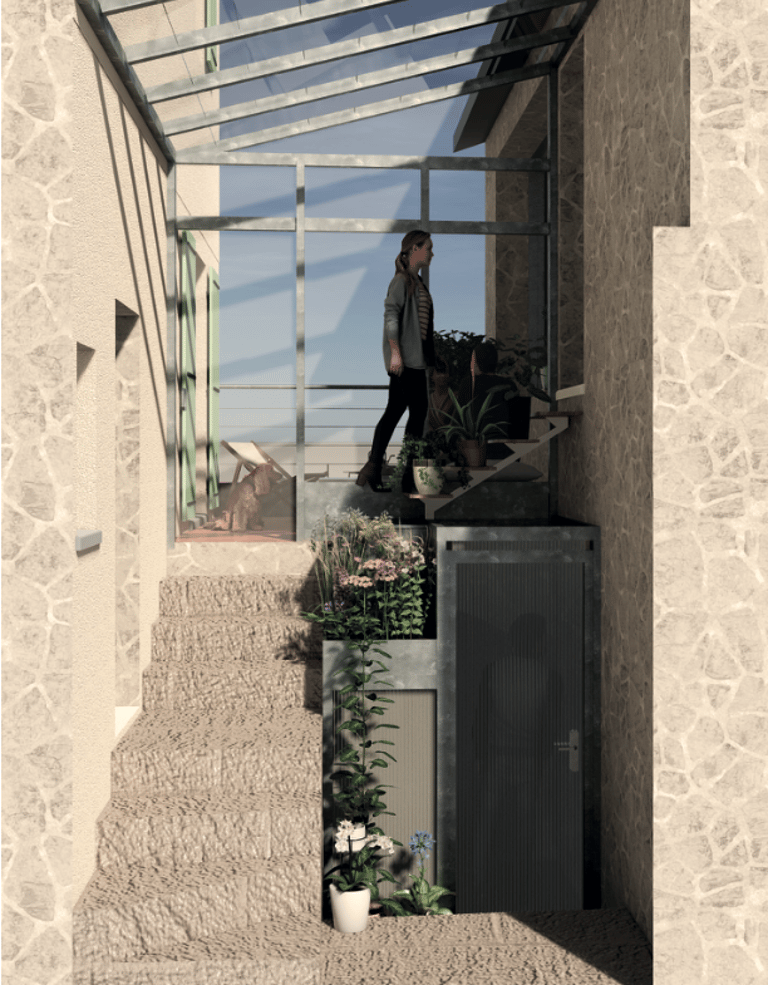 Au niveau bas un cube en polycarbonate est inséré pour créer une nouvelle entrée pour un studio, matériau utilisé pour sa nature translucide apportant à ce studio l’apport lumineux nécessaire tout en le dissimulant du regard extérieur.